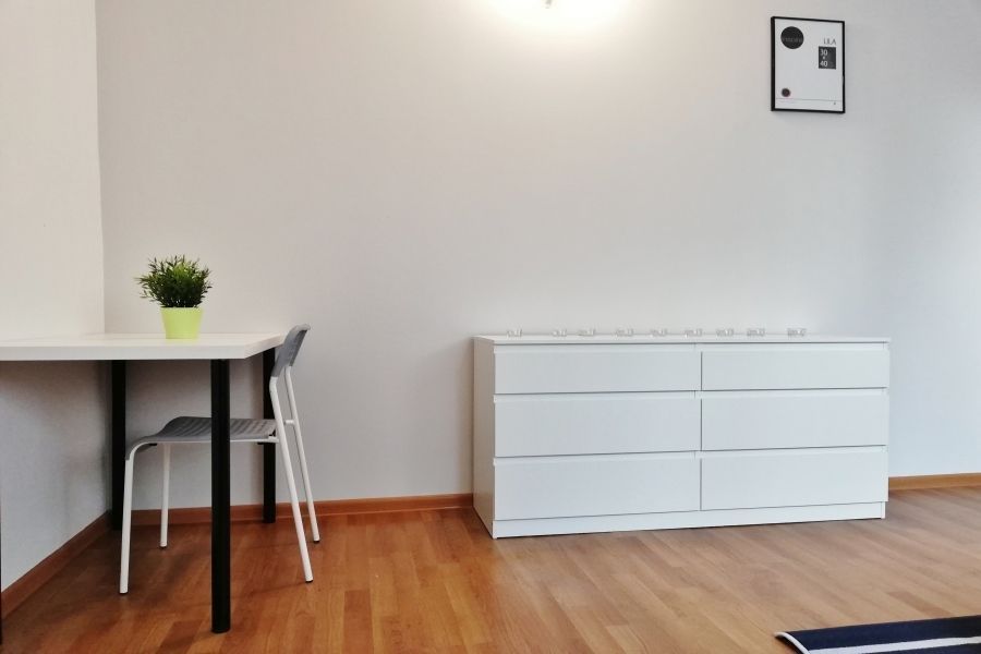 Pokój (zamykany na klucz) wyposażony jest w nowoczesnym stylu oraz w nowe meble: sofę rozkładaną z pojemnikiem na pościel, szafę, biurko, krzesło, komodę, stolik, lampa stojąca, półki ,telewizor
